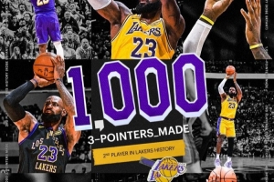 詹姆斯在湖人队已经命中1002记三分球,成为队史继科比之后第二位命中1000+三分球的球员。
